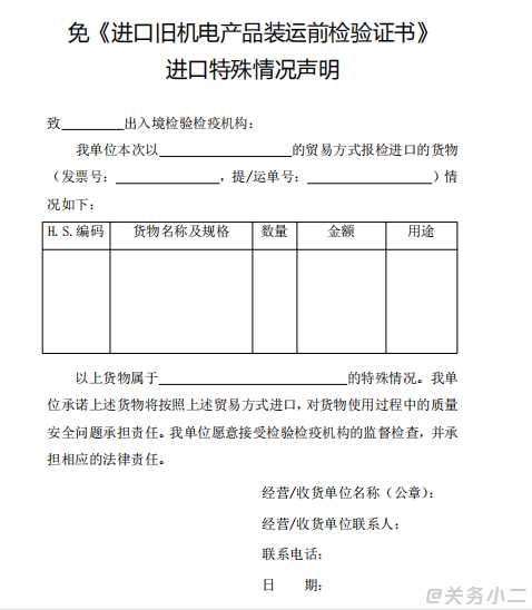 附錄2:免《進(jìn)口舊機(jī)電產(chǎn)品裝運(yùn)前檢驗(yàn)證書》進(jìn)口特殊情況聲明