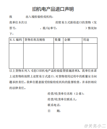 企業(yè)提交的《進(jìn)口舊機(jī)電產(chǎn)品聲明》(附錄1),向主管海關(guān)申報(bào)。 |