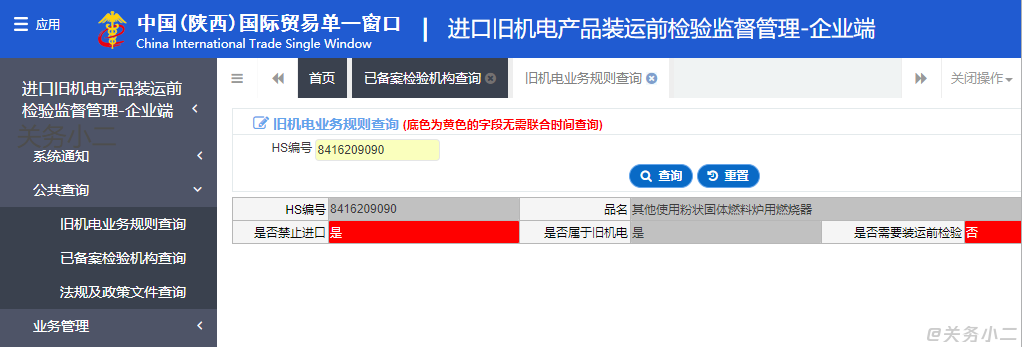 答(2020年12月30日更新):2021年1月1日起,單一窗口上線“進(jìn)口舊機(jī)電產(chǎn)品裝運(yùn)前檢驗(yàn)監(jiān)督管理系統(tǒng)”,企業(yè)可在進(jìn)口前登錄企業(yè)端系統(tǒng)自助查詢(如下圖)或提交裝運(yùn)前檢驗(yàn)審批,海關(guān)將會(huì)通過系統(tǒng)審核回復(fù)告知是否需要進(jìn)行裝運(yùn)前檢驗(yàn)。新系統(tǒng)操作指南請(qǐng)查看>>https://www.guanwuxiaoer.com/thread-2294-1-1.html
